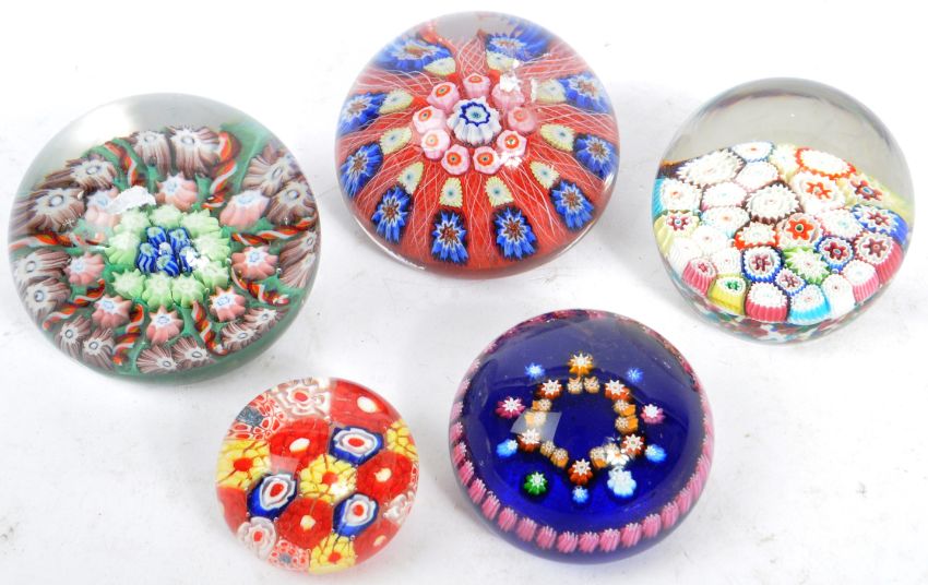 An assortment of six mid century / vintage Murano & Murano style studio art glass and paperweights. Comprising of millefiori canework decorated paperweight examples. Largest measures approx. 7cm (width).