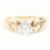 A hallmarked 9ct yellow gold and cubic zirconia engagement style ring. The ring having a round cut white CZ to the centre to pinched cathedral style shoulders each set with an accent stone to tapering shank. Hallmarked for London 1993. Total weight approx 2.9g. Approx size N.
