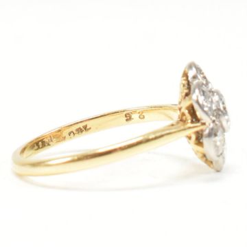 An 18ct gold platinum and diamond daisy cluster ring. The ring set with seven round brilliant cut diamonds to a pierced mount to chenier shoulders and tapering shank. Stamped 18ct Plat. Estimated total diamond weight 1.30cts. Weight 3.2g. Size P. All weights, measurements and sizes are approximate.