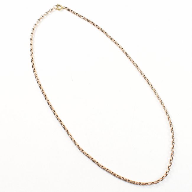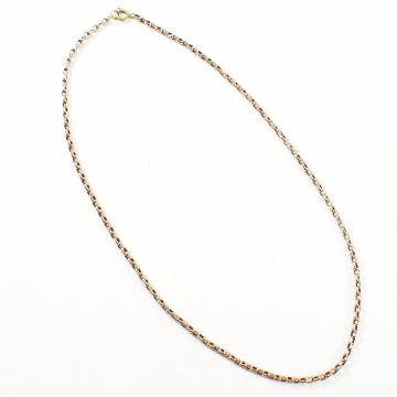 A 9ct rose gold chain necklace. The 9ct rose gold chain marked 9ct and having a replacement gold tone metal c clasp. Chain measures 48cm. Weighs 5.9g. All weights, measurements and sizes are approximate.