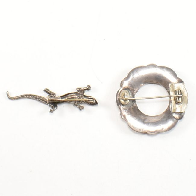A collection of silver and silver gilt jewellery. The jewellery to include a hallmarked 22ct gold on silver hinged bangle, hallmarked for London, 1968. A 19th century malachite and silver brooch pin. A silver band ring, stamped SILVER. A silver lizard brooch pin, unmarked however tests as silver. A silver and gem set ring, marked 925. A silver and gem set star necklace, marked 925. Bangle measures 6.4cm. Malachite brooch measures 4.3cm. Silver band ring size L.5. Silver and gem set ring size P. Lizard brooch measures 5.6cm. Silver and gem set necklace measures 41.5cm. Total weight 62.6g. All weights, measurements and sizes are approximate.
