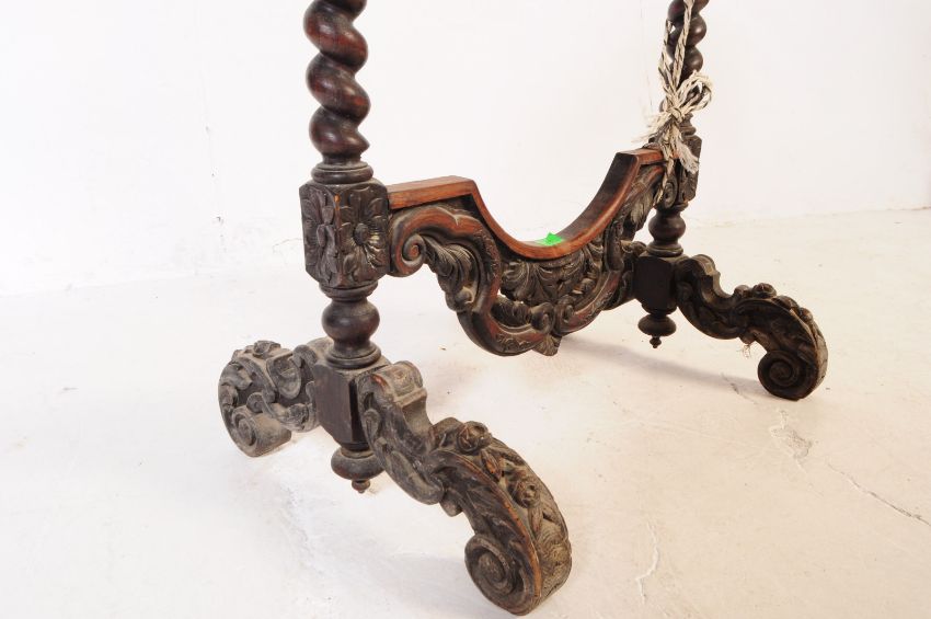 A Victorian 19th century Chinese hanging bronze gong and stand with wooden handled strike. Housed within a ornate carved and frame with barley twist uprights. Finials to corners. Measures approx 107cm (height).