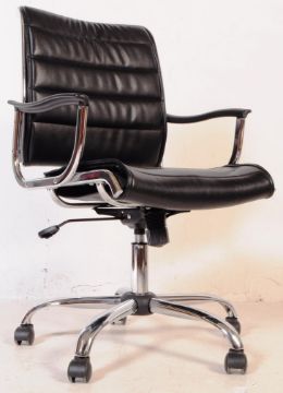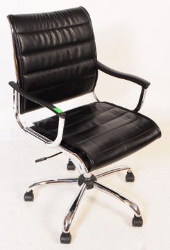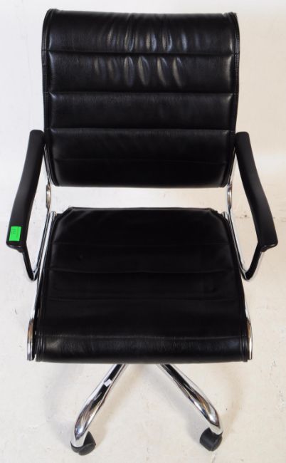 After Charles And Ray Eames - EA117 - Aluminium Group - A contemporary low back swivel office desk chair / armchair having a chromed steel finished frame with black leather ribbed seat and backrest. All raised upon a four point swivel star base and castors. Measures approx; 99x58x54cm