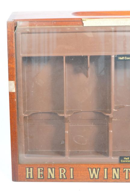 Henri Wintermans - A mid 20th century vintage mahogany wood shop display cigar box of rectangular form with glazed panel to front with original font to lower panel. Measures approx 47cm x 40cm x 8cm.