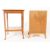 An early to mid century oak wood side table together with an art deco walnut veneer bedside cabinet. Two tier side table raised on curved splayed legs. Bedside cabinet having upper draw space, open shelf to centre, above a hinged door to cupboard space below. Raised on a curved splayed legs. Largest measures 73x51x41cm