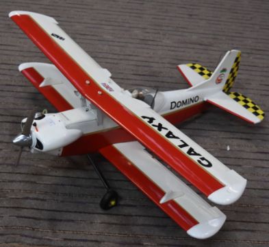 A pre-made kit built RC Radio Control model Biplane ' Domino ' with Gromit pilot figure. Veneered foam wings and balsa wood / plywood body. Fitted with radio gear and front engine. Wing span 115cm.