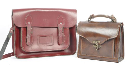 A cherry red leather satchel by The Cambridge Satchel Company. With red stitching, shoulder strap and provision for name and address label, double buckle and slide clip fastening to front. Embossed initials 'JR' to front. Along with another hand stitched brown leather messenger / crossbody bag, with carry handle and brass metal swing latch closure. Satchel measures approx. 32cm (width) x 25cm (height).