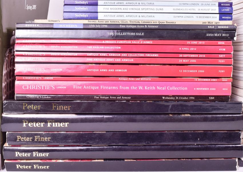 A large collection of Auction House Militaria catalogues and brochures comprising; Thomas Del Mar in association with Sotheby's x16 catalogues spanning 2006-2014, Bonhams Antique Arms & Armour x16 catalogues spanning 1999-2015, Christies x8 catalogues spanning 1994 - 2013 including the Raglan Collection of Crimean War memorabilia belonging to Field Marshal Lord Raglan, x5 Peter Finer catalogues, Wallis & Wallis 37 catalogues spanning 1996-2006, London Park Lane Antique Arms Fair x12 catalogues spanning 2006-2015 and more.