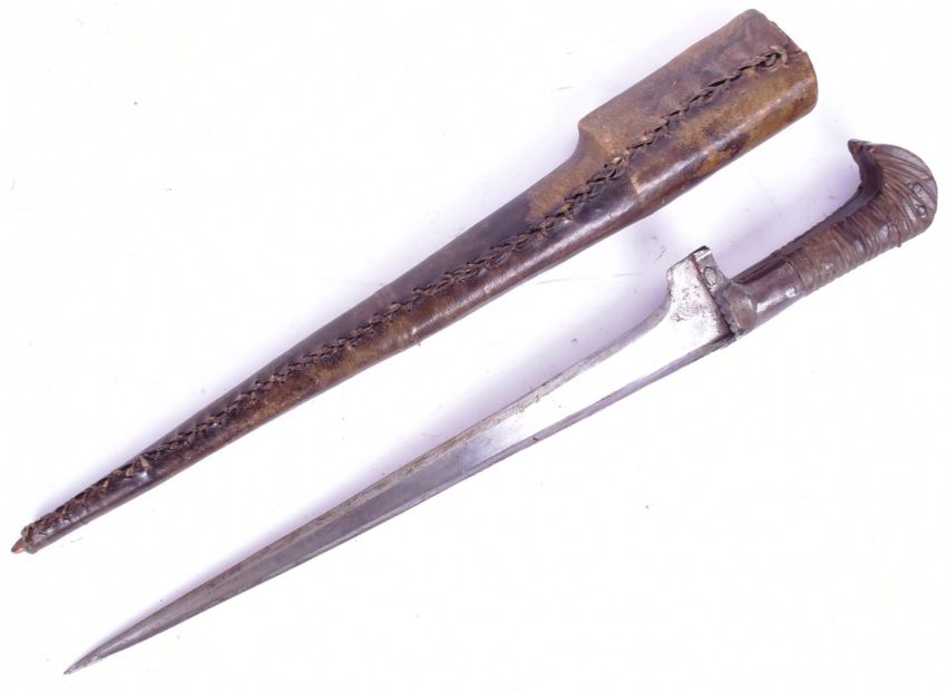 An Eastern Iran / Afghan Khyber knife / Choora knife. Ribbed wooden grip with a hooked pommel and a T-section blade housed in a hide wrapped wooden scabbard. Measures approx 49cm. If this lot is required to be posted please see sale notes regarding age verification.