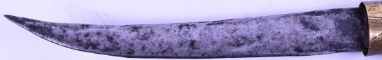 A 19th Century Middle Eastern / Syrian Jambiya dagger. Dome shaped brass pommel with raised pyramid formations continuing down the matching scabbard.  Measures approx 38cm. If this lot is required to be posted please see sale notes regarding age verification.