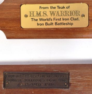 Royal Navy Interest - a Royal Navy ensign flag along with x3 teak wood pieces from naval ships comprising HMS Warrior, HMS Iron Duke (Jutland) and HMS Ormonde. Flag measures approx 45x85cm.