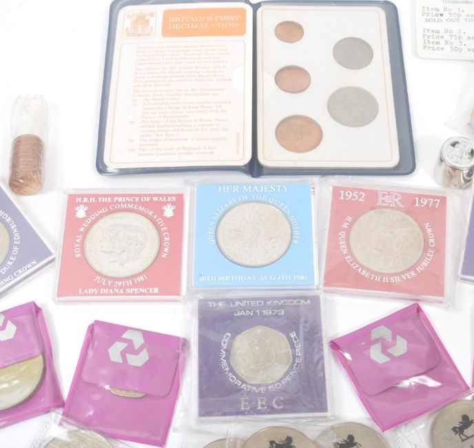 A collection of 20th century British commemorative crown & circulated coins. The collection to include crowns - 11 x HRH The Prince of Wales and Lady Diana Spencer (1981), 3 x Sir Winston Churchill Crowns (1965), 4 x UK Royal Wedding Elizabeth II & Prince Philip (1972), 9 x HM Queen Elizabeth II Silver Jubilee Crowns (1977) and an HM Queen Elizabeth II The Queen Mother's 80th Birthday Crown (1980). A pack of Britain's first decimal coins, multiple Victorian / Georgian pennies / halfpennies, half crowns, two shillings / shillings, sixpences, multiple 50 pence, amongst many others.