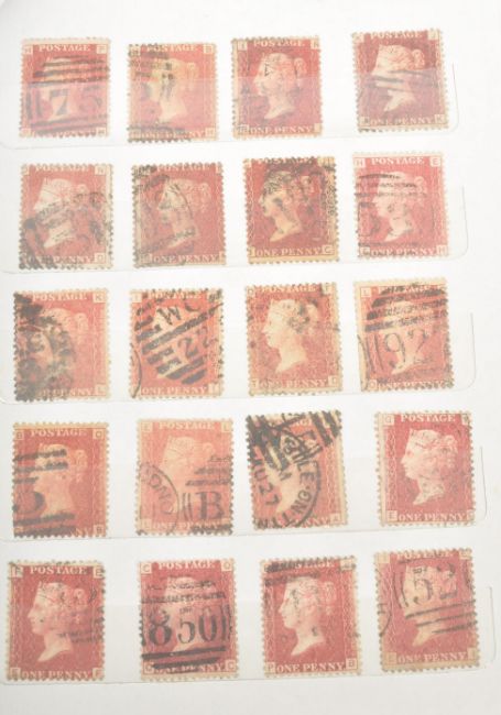 1d Black with red Maltese Cross handstamp and 1d Reds stamp collection of Great Britain Queen Victorian issues (x93) in stock book. 1d Reds Imperforate, Stars and plate numbers types. With two pairs, strip of 3 and several on piece.