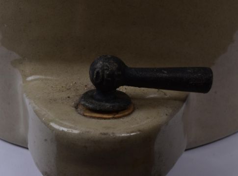 Coates of Somerset Cider - A large mid 20th century Coates of Somerset Cider earthenware cider keg / flagon. The keg having a tap / spigot to front and screw lid atop, featuring an ombré glaze. Having illustration to front and back depicting farmers singing with words 'Coates comes up from Somerset, where the cider apples grow' written above. Measures approx.