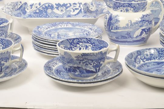 Spode - Italian design - Large extensive contemporary dinner service set. Comprising of serving / casserole dishes, plates of various sizes, teapot, jug, cups and saucers. Makers label to underside. Dish washer / microwave safe. 25cm diameter.