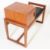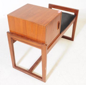 British Modern Design - A mid 20th century teak wood telephone seat table. The seat having a black vinyl upholstered cushion seat, beside a small teak wood cupboard / table. Raised on quadrille manner legs. Measures approx. 60x80x40cm