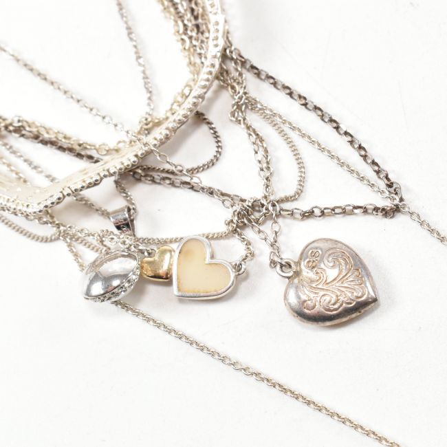 Assorted silver chain necklaces. The collection to include nine necklaces. A hallmarked Italian silver fancy link V necklace, hallmarked for Sheffield. A 925 silver Pandora chain with two jump rings punctuating the chain. A 925 silver engraved heart pendant necklace, marked S.S for sterling silver and chain tests as silver. A 925 silver thin curb chain necklace. A 925 silver chain necklace. A 925 simulated pearl and gem set cluster pendant necklace strung on a Singapore chain. A hallmarked silver Pandora heart pendant necklace, hallmark rubbed. An Italian silver curb link chain, marked 925 and silver. An Italian 925 silver chain. All chains either hallmarked or marked 925. Necklaces measure 40.5cm - 60cm. Total weight 43.8g. All weights, measurements and sizes are approximate.