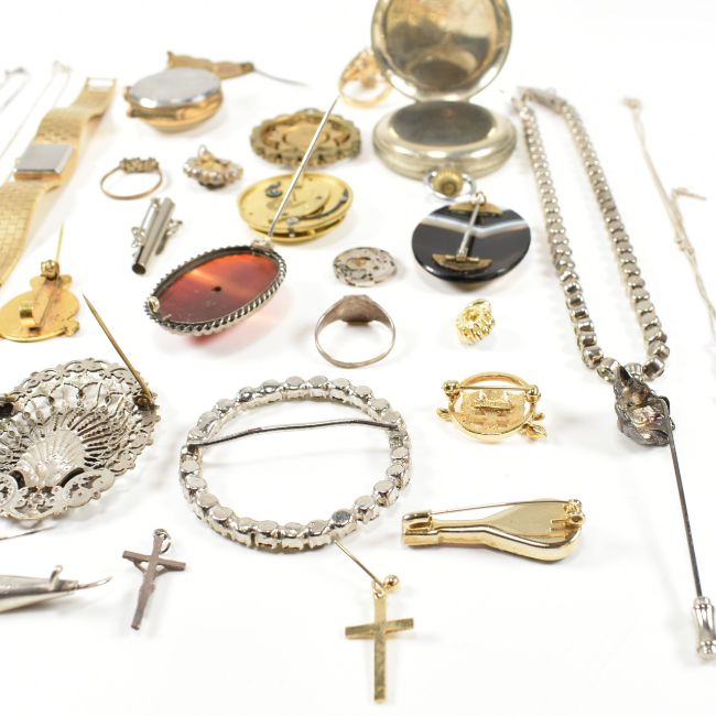 A collection of antique vintage and modern costume jewellery and a Waltham wristwatch. The jewellery to include a rhinestone set snake necklace. Silver enamel St Christopher bracelet. Banded agate brooch pin. Cufflinks. Silver and amber pendant necklace. Micro mosaic brooches. A silver butterfly wing brooch pin. Silver gilt and gem set dress rings. A cat stick pin. An articulating fish pendant. An 800 silver fob watch. A metal pocket pocket watch. A pocket watch part movement. A watch movement marked Cartier. A Pretoria June 20th 1925 Prince of Wales medal. Snake necklace measures total approx 34cm. All weights, measurements and sizes are approximate.