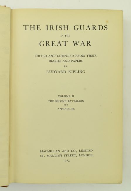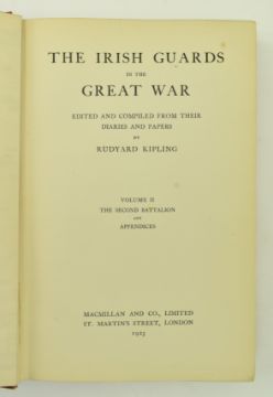 Irish military First World War interest. Two works, comprising 1923 The Irish Guards in the Great War, edited and compiled from their Diaries and Papers by Rudyard Kipling, publ. Macmillan and Co. Limited, 2vol in publisher's original full cloth binding (light discolouration to the spine, head and tail bumped & odd scuff to boards); along with 1952 The Royal Irish Fusiliers 1793-1950 by Marcus Cunliffe publ. Geoffrey Cumberlege at the Oxford University Press, publisher's full cloth binding with just the odd scuff to the boards. 8vo.