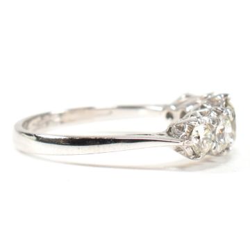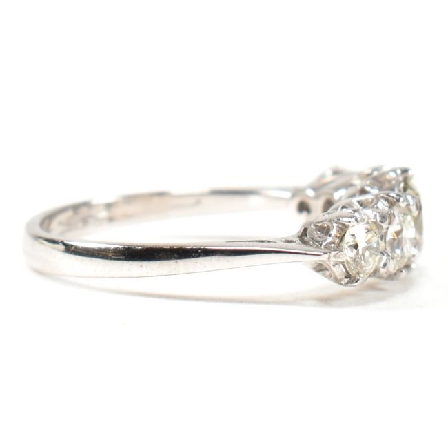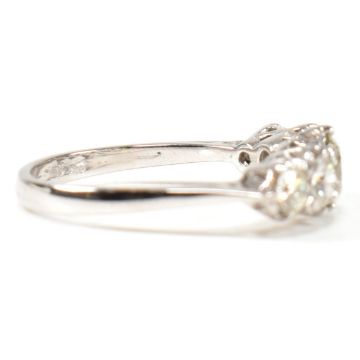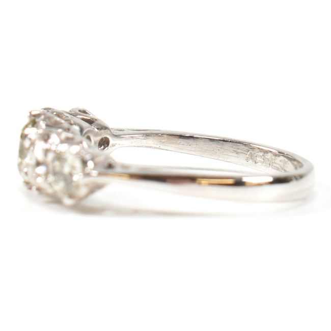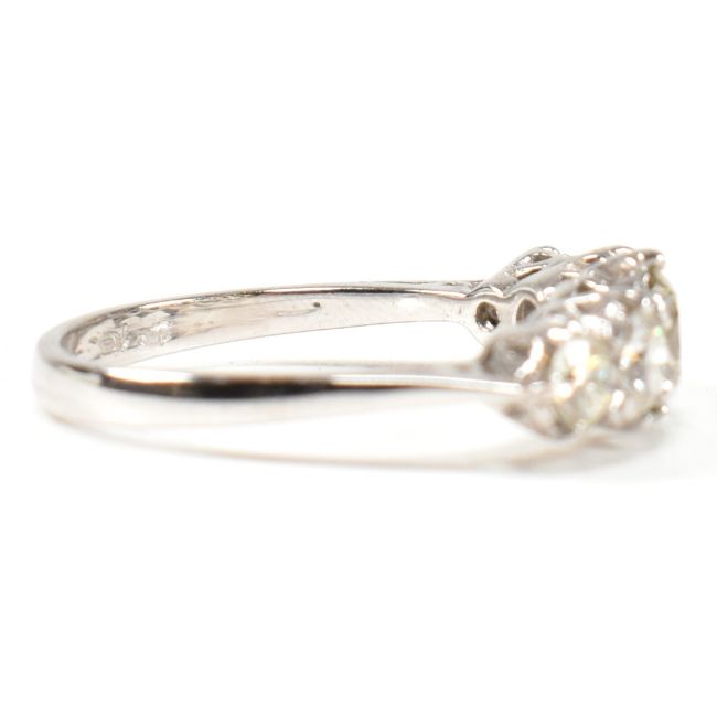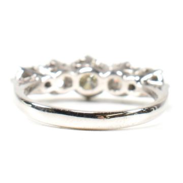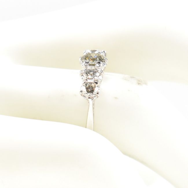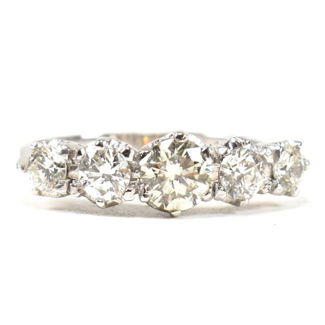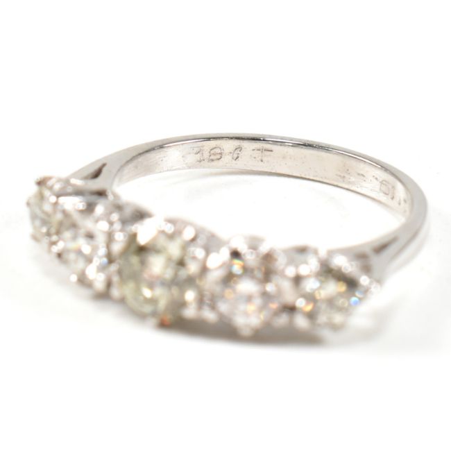 A white gold and diamond five stone ring. The ring set with five graduating round brilliant cut diamonds to tapering shank. Marked 18ct. Estimated total diamond weight 1.19ct. All weights, measurements and sizes are approximate.