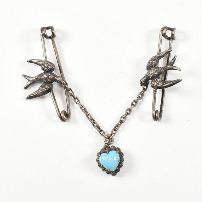 Collection of silver jewellery including French Secessionist brooch pin. The lot to include a 19th century French Secessionist silver brooch pin set with a central pink stone to hinge pin and c clasp verso, marked depose and 985. A silver brooch pin with two swallows on separate pins united by a chain set with a heart shaped blue stone. A pair of hallmarked silver chain style cufflinks having oval heads in engine turn repeating pattern to cable link chain, hallmarked for Birmingham 1961. Cufflinks measure 2.5cm. Art nouveau style brooch measures 3.8cm x 2cm. Swallow brooch measures 7cm. Total weight 17.0g. All weights, measurements and sizes are approximate.