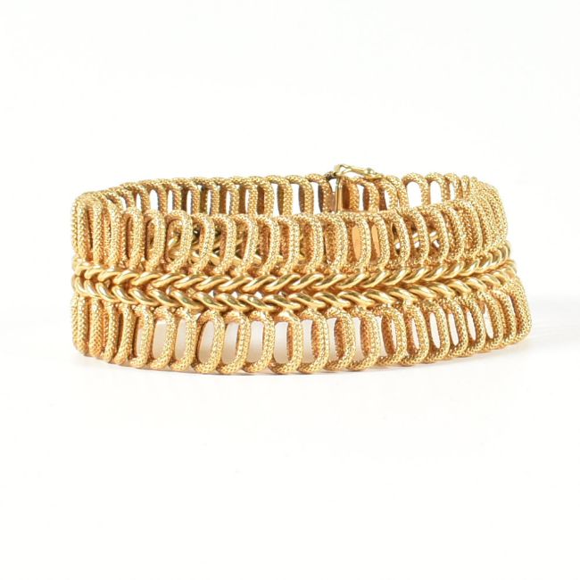 A hallmarked Italian 18ct gold woven link bracelet. The 18ct gold bracelet having a central woven chain flanked by rows of textured oval links to open box clasp and safety catch. Hallmarked for Arezzo, Italy. Sponsor's mark UNO-A-ERRE. Measures 8.5cm x 2.4cm. Weighs 33.3g. All weights, measurements and sizes are approximate.