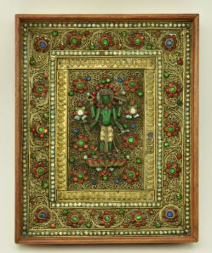 A collection of six early 20th century Tibetan turquoise and hardstone bejewelled items. The lot comprising two lidded trinket boxes, one with wirework & hardstone figure of goddess Chenrezig, two circular copper wall hanging plaques, a glass perfume / snuff bottle raised on brass and hardstone base and with similar mounted lid, and a matched wall hanging depicting Chenrezig. Largest frame measures approx. 21cm x 26cm.