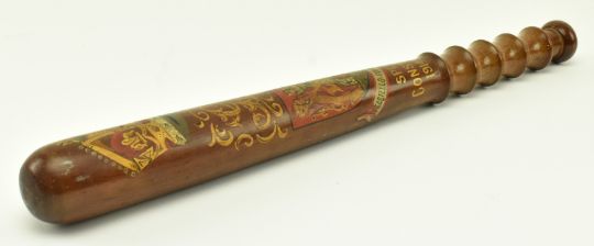 A George V early 20th century lignum vitae hand painted police Special Constable 1914-1919 truncheon. The truncheon having a crown atop with G R initials below. Crest with lions and tower below with banner reading ' Castello Fortior Concordio '. Shaped carved handle. Measures approx. 38cm long.