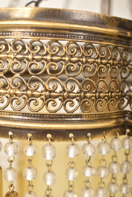 An Art Deco inspired 20th century brassed metal & glass rod ceiling chandelier light. The chandelier having central column with chains holding a flower shaped pierced body with yellow glass rod & beading shade. One rod broken. Measures approx. 60cm tall x 30cm in diameter.