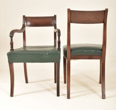 A Regency early 19th century mahogany tilt top pedestal dining table with chairs. The table having a squared top with brass inlaid details, raised on a central thick turned column with splayed saber legs. All raised on brass castors. Together with eight Regency mahogany & leather seat dining chairs, including two carvers. Table measuring approx. 71cm x 146cm x 103cm.