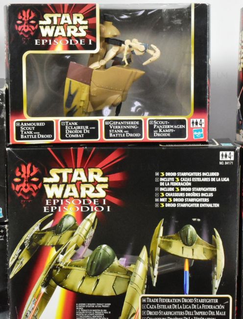 Star Wars - Episode I - a collection of x7 Hasbro made Episode 1 action figure playsets. Comprising: Naboo Fighter, Flash Speeder, Trade Federation Droid Starfighter, Opee & Qui Gon Jinn, Scout Tank, Speeder & Darth Maul and Ammo Wagon. All appearing complete (unchecked by us) and housed within their original boxes.
