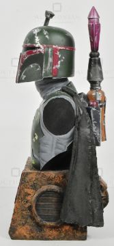 Estate of Jeremy Bulloch - Star Wars - Boba Fett - a likely fan-made resin bust of Boba Fett. Highly detailed, complete with rangefinder and jet pack. Raised on a tapering squared base with Mandalorian insignia. Artist unknown. Measures approx. 16cm tall.