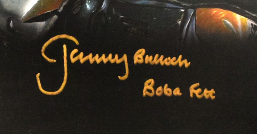 Estate of Jeremy Bulloch - Star Wars - Boba Fett Art - Jeremy Bulloch (1945-2020) - autographed large format art print depicting Fett in various poses. Signed neatly by Bulloch in gold ink to a dark area, with character name added. Unknown artist. Measures 11x14", printed on heavy card stock.  All lots from the estate of Jeremy Bulloch come with a special certificate signed by Maureen Bulloch, confirming the lots were from his personal collection. The majority of the items were displayed in his home museum for several years. Part of the proceeds of this lot will be donated to Parkinson's UK (Charity 258197)