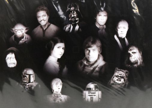 Estate of Jeremy Bulloch - Star Wars - Fan Art - a large format photographic art print depicting the main characters in the Star Wars franchise including Luke, Leia, Vader, Boba Fett, Yoda, Obi-Wan and others. High quality print. Mounted ready for framing, still wrapped in cellophane. Total size: 15x19"