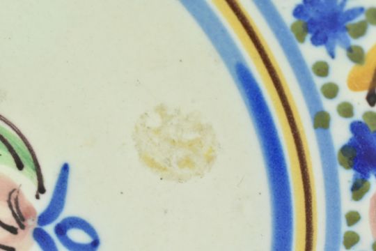Two large late 19th - early 20th century Iznik style Majolica tin glazed earthenware ceramic wall chargers. One charger featuring Persian style floral decoration on blue ground, the other on white ground with line & dot hand painted decoration. Both unmarked. Largest to measure approx. 34.5cm in diameter.