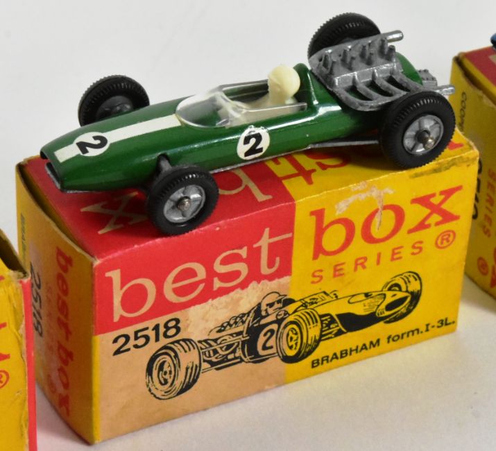 Diecast - x4 vintage Dutch made (Ifabex) Best Box diecast Formula One racing cars comprising 2518 Brabham 3L (x2), 2519 Cooper Maserati and 2520 Lotus. All models boxed, one lacking flap.