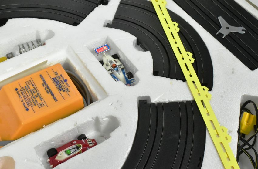 Slot Car Racing - a vintage Aurora Scalextric slot car racing set GX700 along with a boxed lap counter. The set containing x3 cars, track and controllers.