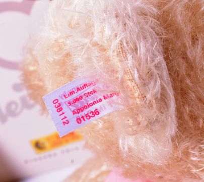 Teddy Bears - an original German Steiff made soft toy teddy bear 038112 Appolonia Margarete. Golden mohair with hand stitched nose and mouth and fully jointed limbs. White tag and button to the left ear. Measures approx 42cm. Boxed with certificate and outer carton.