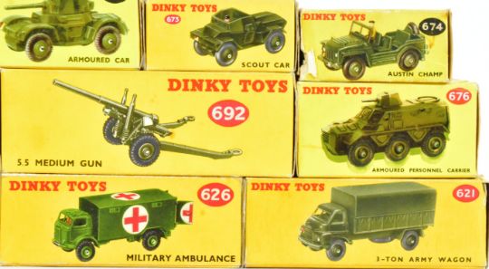 Diecast - a collection of x10 vintage Dinky Toys boxed diecast Military models to include; 670 Armoured Car, 643 Army Water Tanker, 674 Austin Champ and others. Generally appearing VG+. Some wear to boxes.
