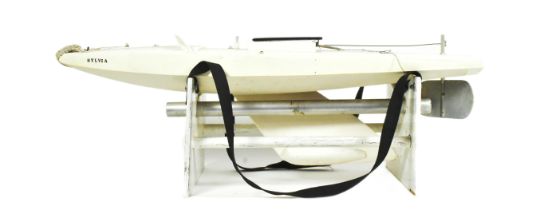Model RC Boat - a well made large scale radio controlled model RC boat, fitted with radio gear, wooden keel and metal rudder. Housed on a wooden carry rack. Measures approx 90cm long.
