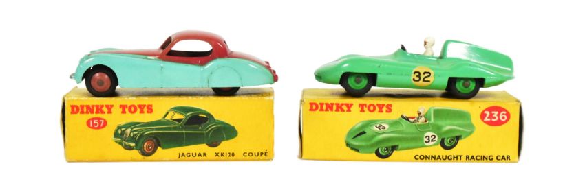 Dinky Toys - x2 original vintage Dinky Toys boxed diecast model cars comprising; 157 Jaguar XK120 Coupe and 236 Connaught Racing Car.