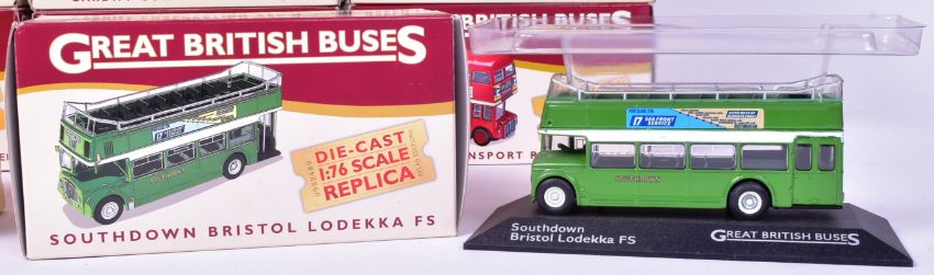 Diecast - a collection of x13 Atlas Edition Great British Buses diecast models to include; London Transport Routemaster, Cardiff Corporation AEC Q, Brighton & Hove AEC Regent and others. Boxed on inner display stands with leaflets.