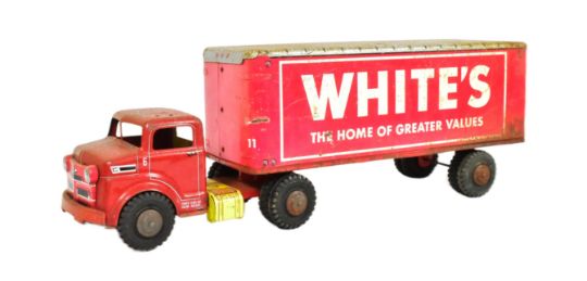 Tinplate Toys - a vintage Marx tinplate ' Whites ' truck and trailer . Lithographed metal in red and white with a detachable front cab and rear opening doors. Measures approx 63cm long.
