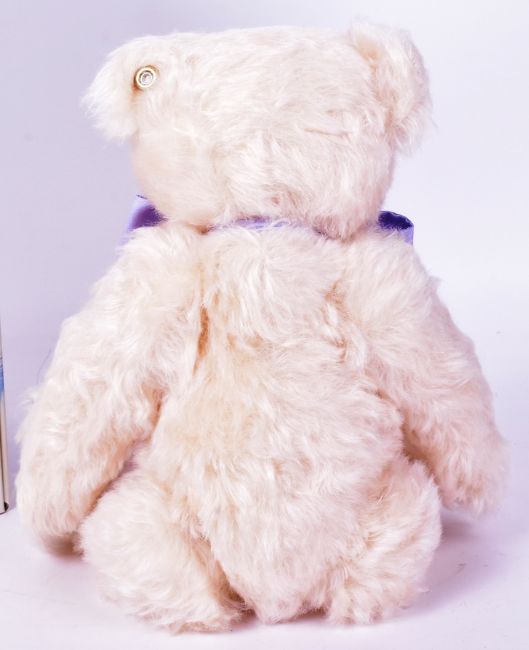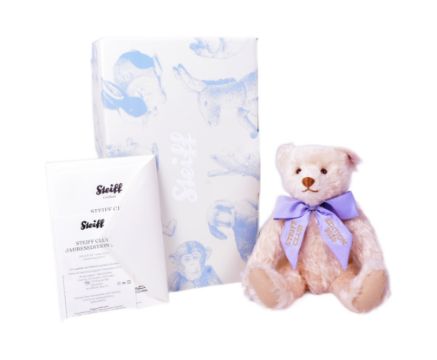 Teddy Bears - an original German Steiff made soft toy teddy bear 421105 Steiff Club 2010 bear. Blonde mohair with lilac ribbon and gold stitching. White tag and button to the left ear. Measures approx 30cm. Boxed with certificates and outer carton.
