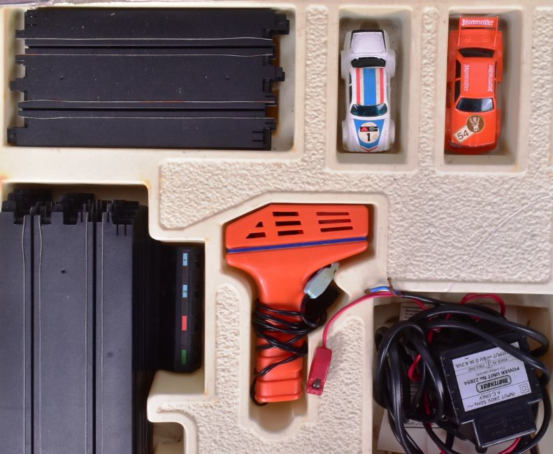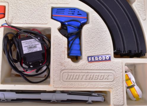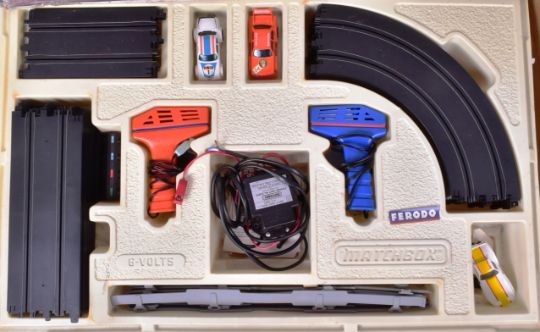Matchbox - a vintage Powertrack 3000 set with working headlights. To include: two controllers, a B.M.W 35, a Jaguar XJ/12, a power unit, a selection of racing track and instant speed lock assembly pieces. Housed within the original box, in VG condition.