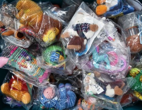 McDonalds Happy Meals - a LARGE collection of vintage 1990s McDonalds Happy Meal toys to include; Monster Nuggets, Barbie, My Little Pony, Peanuts, Little Mermaid, Lion King, Aladdin, Beauty & The Beast, World of Dinosaurs, Pocahontas, Amazing Wildlife, World Cup 1998, Jungle Book, Batman and more. Largely sealed in packets along with associated flatpack boxes and other advertising interest items.