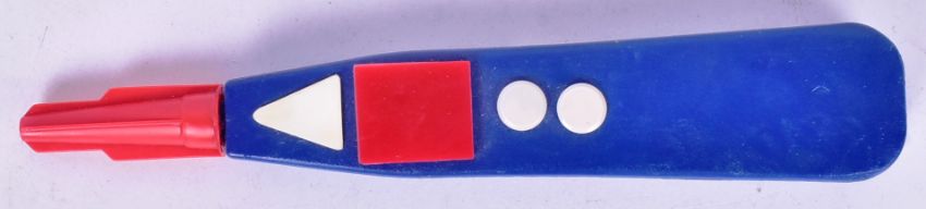 Doctor Who - Sixth Doctor (Colin Baker) - a vintage prop replica Sonic Lance / Screwdriver, signed by 6th Doctor Colin Baker. Plastic construction, in red and blue. Signed to the rear in silver ink by Baker, undedicated. Measures approx: 19cm long.