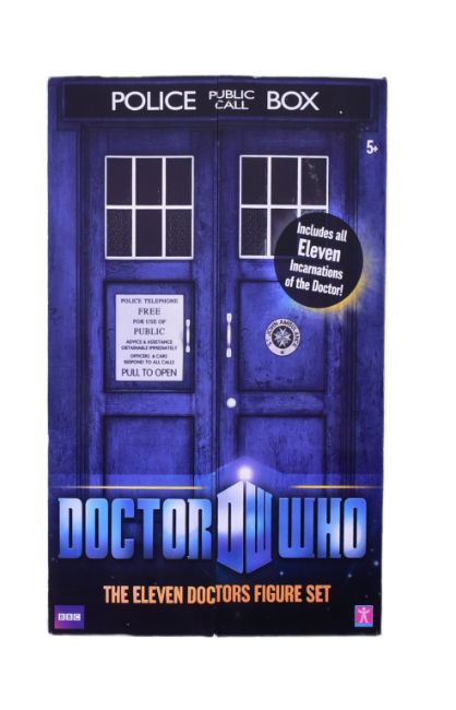 Doctor Who - Character Options - an 'Eleven Doctors Figure Set' boxed action figure set featuring all eleven Doctors. Highly detailed. Housed within its original 'Tardis' themed display box. Contents mint and complete. Opened, but contents unused.