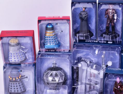 Doctor Who - Eaglemoss Figurine Collection - a collection of 20x assorted official BBC Dr Who Figurine Collection diecast / metal figures, plus magazines. Includes: Cyber Controller (Special 28), War Machine (Special 14), Anne Droid, Exposed Mutant Dalek, The Morax Queen, Auton and others. All housed within their original blisters, contents mint and unused. Highly detailed. Folders of magazines also present (issues may not match the figures)
