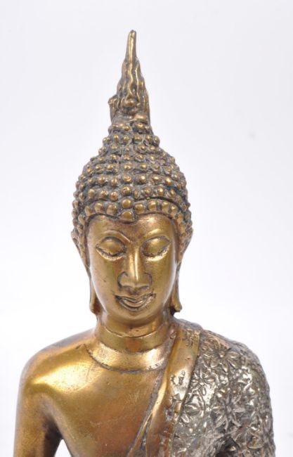 A 20th Century painted bronze figure in the form of Buddha in seated position with legs crossed in silver and gold colourway upon a raised base. Measuring approximately 22cm x 13cm x 8cm.